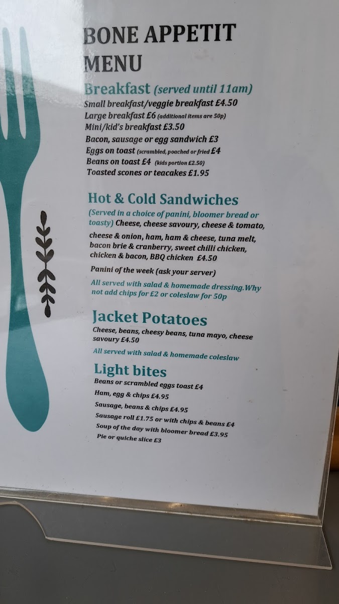 Welcome to Bone Appetit, a charming café nestled on Lowland Rd, Brandon, Durham. This delightful establishment is a haven for food lovers and dog enthusiasts alike. The menu offers a variety of light bites, such as the comforting Beans or Scrambled Eggs Toast and the hearty Ham, Egg & Chips, all reasonably priced. For a quick snack, the Sausage Roll and daily Soup of the Day are delightful choices.